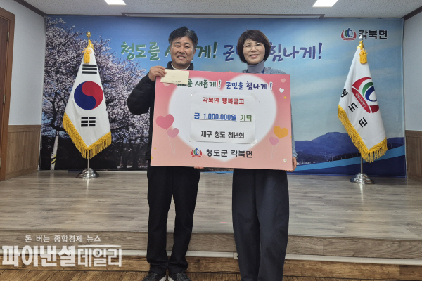 [파이낸셜데일리 박미화 기자] 청도군(군수 김하수) 각북면은 금일 21일 재구 청도 청년회가 각북면 이웃들을 위해 써달라며 ‘함께모아 행복금고’에 100만원을 기탁하며 지역사회에 따뜻한 나눔을 전했다고 밝혔다.