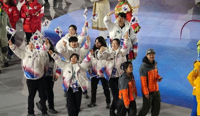 각국 선수단의 입장이 진행됐고, 쇼트트랙 최민정과 황대헌(강원도청)이 공동 기수를 맡은 대한민국 선수단도 모습을 드러냈다.
