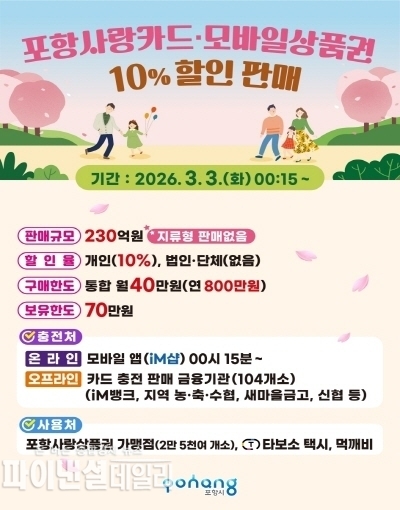 시는 이달까지 포항사랑상품권 830억 원 발행한 데 이어, 이번 할인 판매분 230억 원 추가 발행으로 올해 연초에만 총 1,060억 원 규모의 포항사랑상품권을 유통한다.