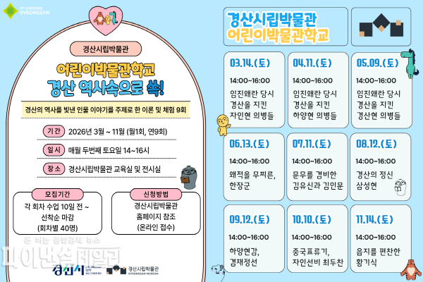 김정기 경산박물관장은 “이번 어린이 박물관학교는 단순한 역사 지식 전달을 넘어, 어린이들이 지역 역사 인물과 이야기를 통해 스스로 생각하고 탐구하는 교육 프로그램”이라며“지역 정체성과 역사 문화에 대한 긍정적 인식을 형성하는 계기가 될 것으로 기대한다”고 말했다.