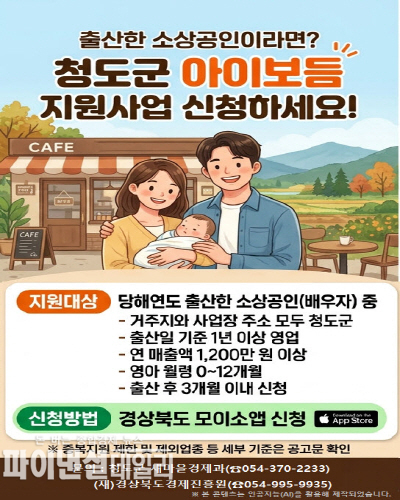 [파이낸셜데일리 박미화 기자] 청도군(군수 김하수)은 출산으로 인한 소상공인의 경영 공백을 줄이고 안정적인 영업활동을 지원하기 위해 “2026년 소상공인 아이보듬 지원사업”을 추진한다고 밝혔다.