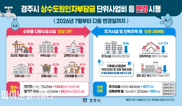 [파이낸셜데일리 박미화 기자] 경주시는 상수도 원인자부담금 부과 단가를 재산정해 오는 7월부터 시행한다고 26일 밝혔다.