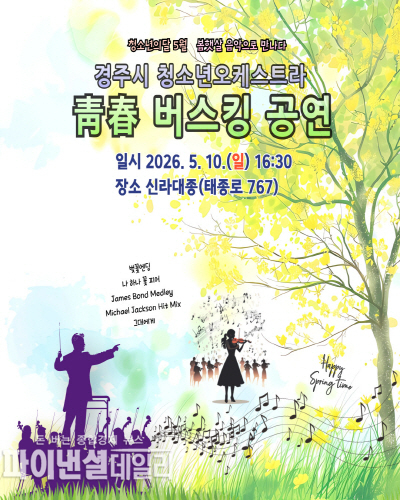 [파이낸셜데일리 박미화 기자] 경주시 청소년오케스트라는 5월 청소년의 달을 맞아 오는 5월 10일 오후 4시 30분 신라대종 앞에서 ‘봄햇살 음악으로 만나다’를 주제로 청소년오케스트라 ‘靑春 버스킹’ 공연을 개최한다고 밝혔다.