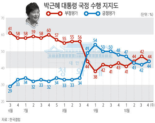 한국갤럽이 전국 성인남녀 1004명을 대상으로 조사해 30일 발표한 10월 넷째 주 주간집계 결과에 따르면 박 대통령의 직무수행에 대한 긍정평가는 44%로 지난주와 비교해 2%포인트 상승했다.