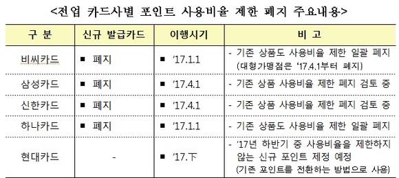 카드사는 포인트 비용 절감과 전액사용에 따른 회원이탈을 방지하기 위해 사용비율을 제한했다. 현재 8개 카드사 중 국민·우리·롯데를 제외한 5개사는 소비자의 포인트 사용비율을 10~50%로 제한하고 있다.