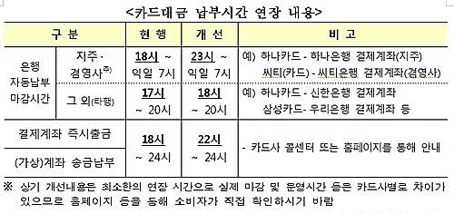 은행 자동납부 마감 시간이 지난 이후에 카드대금을 내는 방법인 즉시출금·송금납부의 최소 마감 시간은 오후 6시에서 오후 10시로 늘어난다.