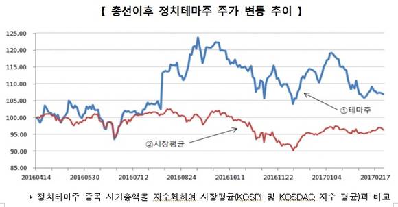 정치테마주는 기업실적과 관계없이 주가 변동성이 크고, 예측이 어려워 투자위험이 매우 높다. 지난해 4월 이후 정치테마주의 주가변동률은 32.3%로 시장 평균(16.7%) 대비 약 2배 높았다.