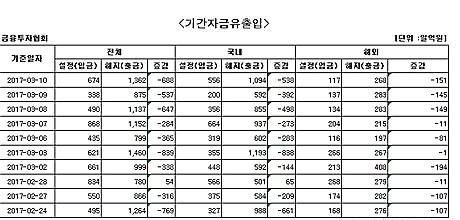 새로 들어온 금액은 556억원, 펀드 환매로 빠져나간 자금은 1094억원이다. 공모펀드에서 591억원 줄었고 사모펀드에서 53억원 늘었다.