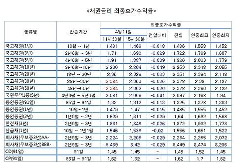 통안증권의 경우 1년물 금리는 1.470%, 2년물은 1.611%로 각각 1.5bp와 2.9bp씩 떨어졌다.