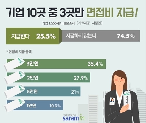 면접비로는 평균 3만2000원을 지급하는 것으로 조사되었다. 기엽형태별로는 대기업 3만6000원, 중견기업 3만5000원, 중소기업 3만원의 순으로 집계됐다.