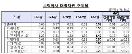 보험사 대출여신 부실채권 규모는 9526억원으로 집계됐다. 전분기말(9442억원)대비 0.9%(84억원) 증가한 수치다. 부실채권비율은 전분기말에 이어 0.45%를 기록했다.