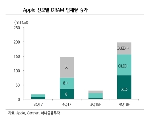 김록호 하나금융투자 연구원은 "2018년 하반기 모바일 DRAM 수요의 가장 큰 변수는 아이폰 신모델이 될 것으로 판단된다. 신모델은 전작보다 D램 탑재량이 증가할 것으로 예상된다"면서 "그에 따라 신규모델의 올해 하반기 D램 소요량은 2017년 하반기의 아이폰X 포함한 8시리즈보다 38% 증가할 것으로 추정된다"고 말했다.