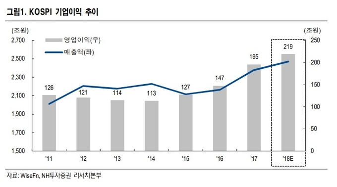 김재은 NH투자증권 연구원은 29일 "한국 기업이익은 2014년 이후 해마다 성장하고 있으며 올해도 이익 성장은 지속될 것으로 전망한다"며 "올해 코스피 영업이익은 219조원으로 지난해 대비 15% 증가할 것으로 예상된다"고 했다.