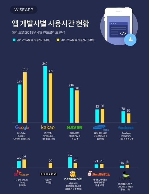 29일 앱분석 업체 와이즈앱은 지난달 한국 앱 개발사 별로 운영 중인 안드로이드 스마트폰 앱의 사용시간을 조사해 이같은 결과를 발표했다.