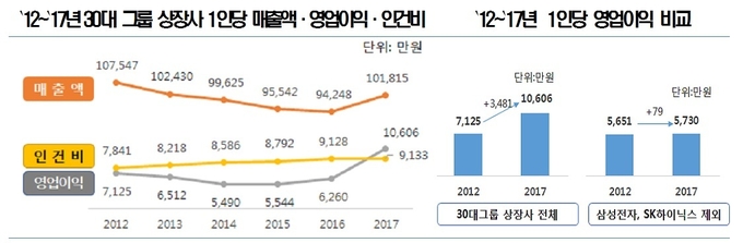 삼성전자와 SK하이닉스를 제외한 30대 그룹 상장사의 1인당 매출액은 2012년 이후 2016년까지 줄곧 감소했으나 2017년 9억2628만원으로 회복됐다. 1인당 영업이익은 2014년까지 감소하다 2015년부터 올라 5730만원으로 늘었다. 2012년 대비 2017년 1인당 매출액과 영업이익은 각각 90.0%와 101.4% 수준이었다.