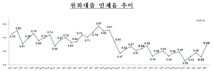11일 금융감독원에 따르면 4월말 국내은행의 원화대출 연체율은 0.59%로 전월말(0.42%)에 비해 0.17%p 상승했다. 이는 지난 2016년 11월말 이후 1년 5개월 만의 최고치다. 지난해 같은 기간과 비교해서도 0.05%p 올랐다.