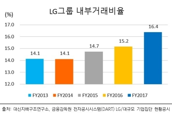 18일 대신지배구조연구소에 따르면 LG그룹의 상장·비상장 계열사 70곳의 공정거래위원회 및 금융감독원 공시 자료를 분석한 결과, 2014년 14.1%였던 그룹의 내부거래 비율은 지난해 16.4%로 높아졌다.