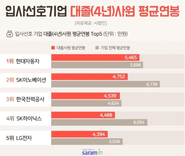 구인구직 매칭 플랫폼 사람인(대표 김용환)이 ‘연봉정보’ 서비스를 기반으로 상반기 구직자 1024명을 대상으로 조사한 ‘입사하고 싶은 기업 TOP 10’의 사원 평균연봉을 분석한 결과, 4년대졸 사원의 평균연봉은 ▲현대자동차가 5465만원으로 1위였다. 이어 ▲SK이노베이션(4752만원)이 2위, ▲한국전력공사(4539만원)가 3위였다.