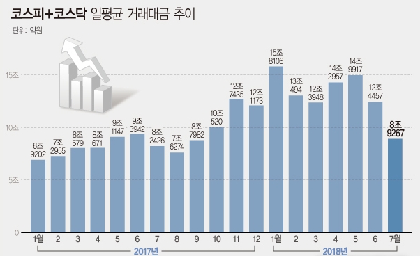 23일 한국거래소에 따르면 7월 초부터 지난 20일까지 코스피와 코스닥을 합한 월 평균 거래대금은 8조9267억원으로 집계됐다. 이는 지난 6월 12조4457억원보다 3조5191억원 감소한 규모다. 특히 올해 1월 15조8106억원과 비교하면 43.5% 감소하며 사실상 반토막이 났다.