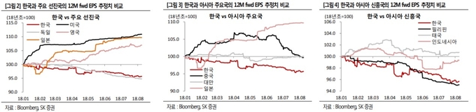 미국 증시가 이익 기대감에 상승세를 회복한 반면 한국의 경우 기업들의 이익 기대감이 낮아 증시 부진이 지속되고 있다는 분석이 나온다. 9일 SK증권에 따르면 한국의 이익 기대감은 세계 국가 중 가장 낮은 수준을 기록하고 있다.