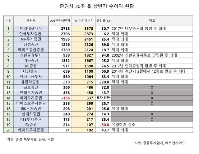 이 밖에 ▲7위 키움증권 1667억원 ▲9위 대신증권 1100억원 ▲12위 교보증권 486억원 ▲13위 한화투자증권 450억원 ▲14위 하이투자증권 337억원 ▲15위 이베스트투자증권 299억원 ▲16위 IBK투자증권 291억원 ▲17위 현대차증권 274억원 ▲18위 KTB투자증권 217억원 ▲19위 SK증권 107억원 ▲20위 케이프투자증권 102억원 등의 차례로 상반기 순이익이 집계됐다.