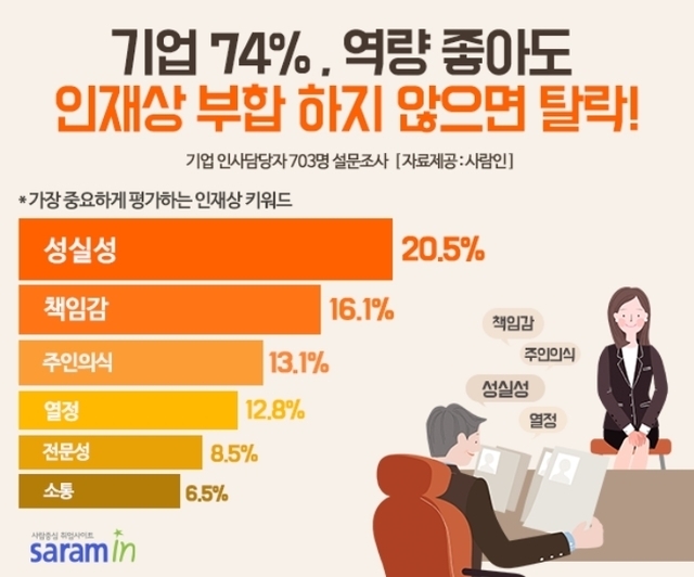인사담당자들이 가장 중요하게 평가하는 인재상 키워드를 조사한 결과 ‘성실성’(20.5%)이 1위를 차지했다. 이어 ‘책임감’(16.1%), ‘주인의식’(13.1%), ‘열정’(12.8%), ‘전문성’(8.5%), ‘소통’(6.5%), ‘팀워크’(5.7%), ‘도전정신’(4.8%), ‘정직’(4%), ‘고객중심’(2.1%), ‘창의’(1.8%) 등의 순으로 답했다.
