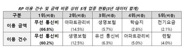 아파트 관리비의 경우 RP를 이용한 금액 및 건수가 최근 3년 연평균 218.6%, 237.7% 증가했다. 4대보험과 도시가스, 전기요금 업종도 매년 큰 폭 증가세를 보이고 있다.