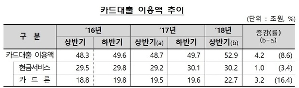 13일 금융감독원에 따르면 올해 상반기 카드대출(현금서비스·카드론) 이용액은 52조9000억원으로 집계됐다. 이는 전년 동기(48조7000억원)대비 8.6% 늘어난 수준이다.