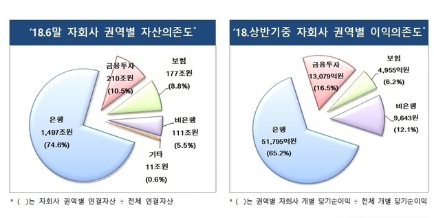올들어 금융지주회사의 금투와 은행 자회사에 대한 이익의존도가 커졌다. 금투 자회사는 14.7%에서 16.5%, 은행 자회사는 60.5%에서 65.2%로 전년 동기대비 상승했다.