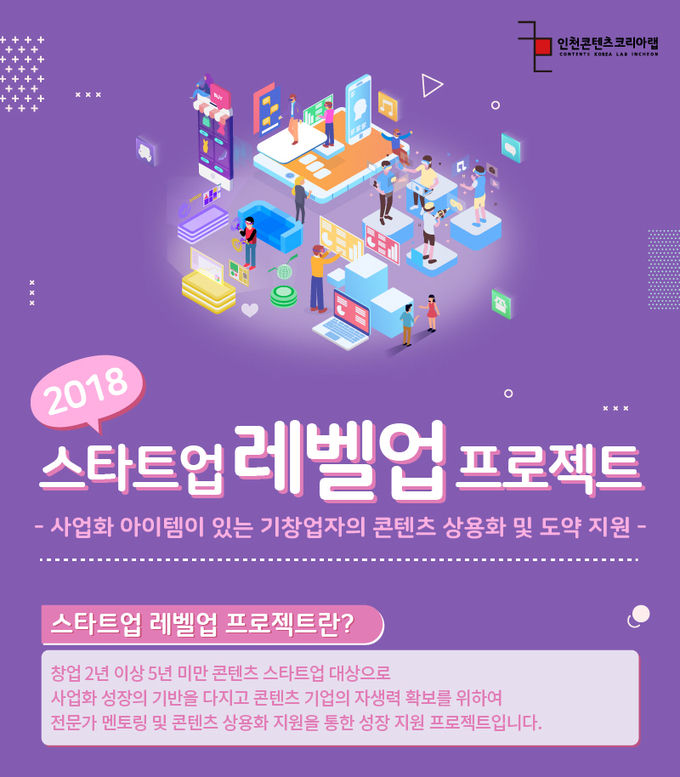 스타트업 레벨업 프로젝트는 콘텐츠(만화, 캐릭터, 애니메이션, 영화, 음악, 게임 출판, 패션, 공연, 공예 등 문화산업 전 분야)를 활용하여 콘텐츠 장르간, 기술간 융합에 기반한 새로운 창작과 비즈니스 사업화를 희망하는 2년 이상 5년 미만의 기업이라면 누구나 지원이 가능하며, 인천콘텐츠코리아랩 홈페이지를 통해 회원가입 후 신청할 수 있다. 기타 자세한 사항은 인천콘텐츠코리아랩으로 문의하면 된다.