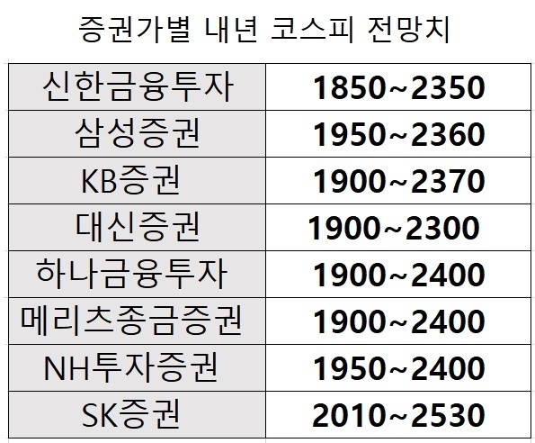 14일 금융투자업계에 따르면 최근 주요 증권사 8곳이 내년 코스피 예상 범위를 내놓은 결과 가장 높은 전망치가 2530이고, 최저치가 1850이었다. 지난 13일 현재 코스피는 2071.23에 마감했다.