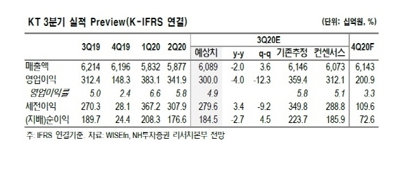 이에 대해 "신종 코로나 바이러스 감염증(코로나19) 영향에 따른 KT에스테이트와 BC카드 등 일부 자회사의 부진, 올해 임금단체협상에 따른 인건비 소급비용 약 800억원이 일회성으로 반영될 것"이라고 전망했다.