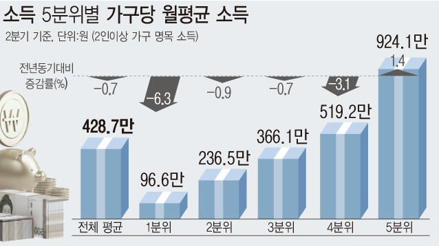 올해 2분기에 소득이 늘어난 분위는 상위 20% 구간뿐이다. 2분위(20~40%·-0.9%), 3분위(40~60%·-0.7%), 4분위(60~80%·-3.1%)는 모두 감소세를 보였다.