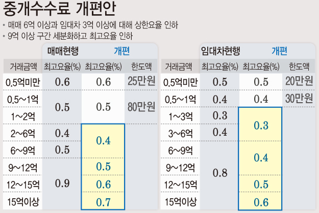 매매계약의 경우 중개보수 요율이 6억~9억원 미만은 현행 최대 0.5%에서 0.4% 이내로, 9억~12억원 미만은 0.9%에서 0.5%로, 12억~15억원 미만은 0.9%에서 0.6%로, 15억원 이상은 0.9%에서 0.7% 이내에서 협의해 결정할 수 있다.