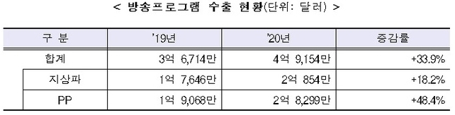 방송프로그램 수입액은 약 5900만 달러로 PP의 방송프로그램(완성품) 수입 규모 축소 등으로 2019년 대비 3764만 달러(38.8%↓)가 감소했다.
