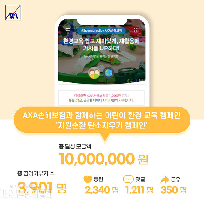 16일 AXA손해보험은 환경실천연합회, 카카오와 함께 지난달 20일부터 이달 10일까지 '자원순환 탄소지우기' 모금 캠페인을 벌인 결과 3,901명이 참여해 1천만원을 모았다고 밝혔다.