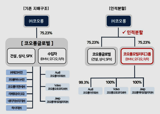 BMW와 아우디, 볼보, 지프, 롤스로이드 등 수입차부문은 신설법인 코오롱모빌리티그룹㈜으로 분할하고 기존의 건설과 상사부문, 코오롱스포렉스와 그 외 자회사는 존속법인 코오롱글로벌㈜에 남는다.