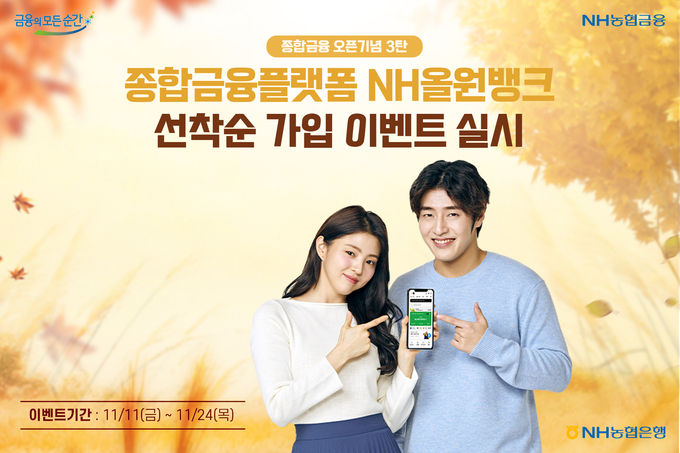 [파이낸셜데일리 정경춘기자] NH농협은행(은행장 권준학)은 종합금융플랫폼 ‘NH올원뱅크’오픈을 기념한 이벤트 「NH올원뱅크 가입하면 선물 팍팍!」을 11월 11일부터 11월 24일까지 실시한다고 11일 밝혔다.
