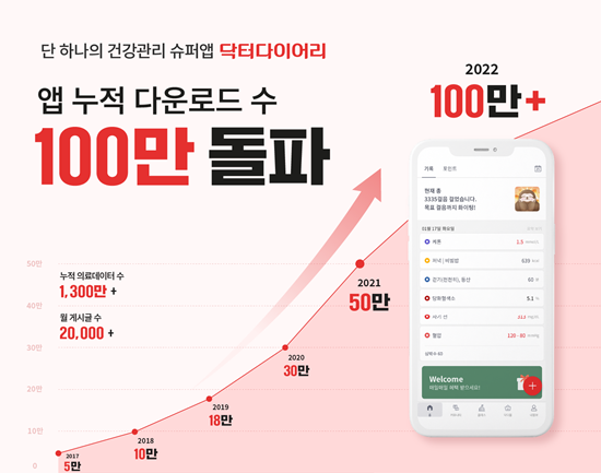 [파이낸셜데일리 이정수 기자] 디지털 헬스케어 기업 닥터다이어리(대표 송제윤)는 자사의 어플리케이션이 누적 100만 다운로드를 돌파했다고 1일 전했다.