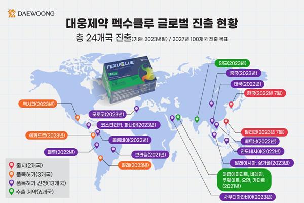 대웅제약은 ‘25년 30개국 품목허가 신청, 27년 100개국 진출’ 목표를 위해 글로벌 시장 공략에 더욱 박차를 가하고 있다. 올해 품목허가를 신청을 25개국으로 늘리고 품목허가 획득도 6개국 이상으로 확대할 계획이다.
