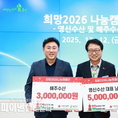 [파이낸셜데일리 박미화 기자] 울진군은 지난 12일 ‘희망2026 나눔캠페인’을 통해 영신수산 남영한 대표로부터 성금 500만원과 해주수산 권일재 대표로부터 성금 300만원을 각각 기탁받았다고 밝혔다. 희망2026 나눔캠페인은 지역 내 어려운 이웃을 돕기 위한 성금모금 캠페인으로, 기탁된 성금은 관내 저소득층과 사각지대 해소를 위해 사용될 예정이다. 영신수산 남영한 대표와 해주수산 권일재 대표는 매년 울진 지역의 어려운 이웃을 위해 꾸준한 나눔 활동을 이어오고 있으며, 이번 기탁과 관련해“지역사회에 조금이나마 보탬이 되기를 바라는 마음으로 성금을 기탁하게 됐다”며“앞으로도 다양한 사회공헌 활동을 통해 지역에 이바지하고 싶다”라고 전했다. 울진군 관계자는“어려운 경제 여건 속에서도 꾸준히 이웃 사랑을 실천해주고 계신 기탁자들께 깊이 감사드린다”며“기탁된 성금은 꼭 필요한 곳에 투명하고 소중하게 사용하겠다”고 말했다.