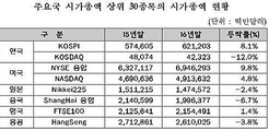 지난해 코스닥시장 시가총액 상위 30종목의 전년 대비 시총 증가율이 마이너스를 기록하며 6개 주요국의 대표 지수 가운데 가장 많이 감소한 것으로 나타났다.6일 한국거래소에 따르면 지난해 코스닥시장 내 시총 상위 30종목의 시총은 전년보다 약 6조6021억원(12.0%) 줄었다. 이는 한국(KOSPI·KOSDAQ)·미국(NYSE·NASDAQ)·일본·중국·영국·홍콩 등 6개 국가의 대표지수 구성 종목 가운데 가장 큰 폭으로 감소한 규모다. 이에 반해 코스피 상위 30종목의 시총은 전년 말 대비 약 53조4945억원(8.1%) 늘며 미국 NYSE 종합지수(9.8%) 다음으로 높은 증가율을 보였다.전체 지수 등락률은 영국 FTSE100 지수가 전년 말 대비 14.4% 오르며 가장 큰 상승률을 기록했고, 중국 상하이 종합지수는 14.0% 하락하며 가장 큰 폭의 하락률을 보였다. 코스피지수는 전년 말 대비 3.3% 올랐고 코스닥지수는 7.5% 내렸다.주요국 시총 1위사의 시총 증감률로는 코스피·코스닥시장 대장주인 삼성전자와 셀트리온이 각각 두 번째, 세 번째로 높은 증가율을 기록했다. 삼성전자의 시총은 지난 1년간 33.0% 증가하며 영국 FTSE100의 로얄더치쉘 C