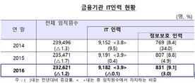 금융기관 전제 임직원 수가 줄어들고 있지만 정보보호 관련 인력은 늘어나고 있는 것으로 나타났다. 잇따른 개인정보 유출 사고로 은행 등 금융회사들이 정보 보안을 강화하는 노력을 기울이고 있기 때문이다.10일 한국은행이 내놓은 '2017년도 금융정보화 추진현황' 자료에 따르면 금융기관 전체 임직원수는 작년 말 기준으로 23만2621명으로 2015년 말 23만5471명 대비 1.2% 감소했다.임직원 가운데 정보기술(IT)인력은 9182명으로 전년 말 9191명 비해 0.4% 감소했다. 하지만 정보보호 인력은 831명으로 전년 말 807명에 비해 3.0% 증가한 것으로 나타났다.IT인력 가운데 정보보호 인력이 차지하는 비중도 8.8%에서 9.1%로 늘어났다. 2014년부터 2016년까지 최근 3년 데이터를 비교해보면 전체 임직원수는 ▲23만9496명 ▲23만5471명 ▲23만2621명 등으로 감소세를 나타내고 있는 반면 정보보호 인력은 ▲769명 ▲807명 ▲831명으로 증가 추세다.한국은행 관계자는 "정보보호부문 인력이 3.0% 늘어나 통계 작성 시작(2013년) 이후 증가세가 지속됐다"며 "다만 증가폭은 전년(4.9%)보다 축소됐다"고 설명했다.IT인력 아웃소싱