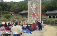 [파이낸셜데일리 박미화 기자] 경북 영천의 수도사(주지 혜휴스님)은 21일 초하루를 맞아 수도사가 소장하고 있는 보물 ‘수도사 노사나불 괘불탱 (修道寺 盧舍那佛 掛佛幀)’을 사부대중에게 공개했다고 밝혔다. 수도사 노사나불 괘불탱은 매년 양력 9월 넷째주 일요일에 공개하기로 하였으나, 올해에는 9월28일 우천관계로 오늘 공개되었다. 숙종 30년(1704)에 그려진 괘불탱의 노사나불은 둥근 얼굴에 화려한 보관을 쓰고 있으며, 연꽃가지를 오른손으로 들고 왼손으로 받치고 있는 모습으로 보관 주위에는 비로자나불 형태의 조그만 불상이 7개 있으며, 뒤로 머리광배가 둥글게 둘러져 있으며, 붉은색과 녹색을 주로 사용하여 조선 후기 불화의 특징을 잘 나타내고 있다. 이날 공개 행사에는 제10교구 본사 은해사 주지 덕조스님과 진불암 주지 정각스님을 비롯한 많은 사부대중이 동참하여, 화려하게 나투신 노사나불 부처님을 맞이하고, 부처님에 대하여 예경하며 아름다운 불교미술을 경탄했다. 수도사는 647년(신라 진덕여왕 원년)에 자장율사와 원효대사가 함께 창건하고 영천의 치산계곡에 위치하여 아름다운 자연경관과 함께 심신의 안녕과 평화로운 마음을 찾기위해 많은 관광객이 찾는 명찰이다.