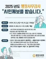[파이낸셜데일리 박미화 기자] 영천시의회(의장 김선태)는 2025년도 행정사무감사를 앞두고 10월 31일까지 시민제보를 받는다고 밝혔다. 제보대상은 시정 전반에 관한 위법·부당한 사항, 주요시책과 사업에 대한 개선 및 건의사항, 주요사업의 예산낭비 사례 등이며 접수된 내용은 행정사무감사를 위한 참고자료로 활용된다. 다만, 개인의 사생활을 침해하는 사항, 진행 중인 재판이나 수사 중인 사건, 단순민원은 제외된다. 참여는 영천시의회 홈페이지(https://council.yc.go.kr) 행정사무감사 시민제보 게시판이나 방문 및 우편 등 다양한 방법으로 할 수 있으며, 영천시의회는 다가오는 제249회 제2차 정례회 회기 중인 11월 26일부터 12월 2일까지 7일간 시정 전반에 대한 행정사무감사를 진행 할 예정이다.