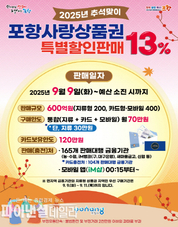 [파이낸셜데일리 박미화 기자] 포항시는 추석 명절을 앞두고 골목상권 소비 촉진과 지역경제 활력 제고를 위해 오는 9일부터 포항사랑상품권 600억 원을 13% 특별할인 판매한다고 밝혔다. 이번 특별할인분은 지류형(종이) 200억 원, 카드형·모바일 상품권 400억 원 등 총 600억 원 규모로, 예산 소진 시 조기 종료된다. 총액은 지난 설 명절보다 100억 원을 확대한다. 특히, 지류형 상품권을 설보다 50억 원 늘린 200억 원을 공급해 전통시장과 골목상권 매출 증대에 힘을 보탠다. 시는 이번에 상향된 13% 할인율을 연말까지 적용해 특별할인분 판매 후에도 매월 초 같은 할인율로 발행한다. 이를 통해 시민들의 가계 부담을 덜고 소비 촉진과 소상공인 매출 증대를 유도해 지역경제에 활력을 불어넣는다는 방침이다. 개인별 구매 한도는 지류형·카드형·모바일 상품권을 합해 월 70만 원이며, 이 중 지류형은 최대 30만 원까지 가능하다. 카드형·모바일 상품권은 보유 한도를 120만 원으로 늘렸으며, 충전 전 모바일 앱(iM샵)에서 잔액을 확인하면 편리하다. 구매 방법은 지류형 상품권은 165개 판매대행 금융기관에서, 카드형·모바일 상품권은 오는 9일 0시 15분부터