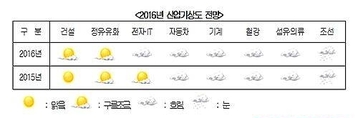 올해 건설과 정유·유화 업종의 전망은 밝은 데 반해 전자·IT·자동차·기계·철강·섬유·의류·조선 등 제조업 전망은 다소 어두은 것으로 나타났다. 27일 대한상공회의소가 최근 10여개 업종단체와 공동으로 '2016년 산업기상도'를 조사한 결과, 건설업종은 지난해 호조세가 올해 상반기까지 유지될 것으로 예상됐다. 올해 건설수주 전망치는 123조원으로 지난해(140조원), 2007년(128조원)에 이어 역대 3번째 수준으로 추정된다. 업계 관계자는 "재작년 하반기 시작된 부동산경기 호조 추세가 상반기까지 이어질 것"이라며 "여기에 이란 제재 해제와 아시아인프라투자은행(AIIB) 공식출범으로 해외건설도 청신호"라고 밝혔다. 정유·유화업종도 나쁘지 않은 것으로 평가됐다. 저유가 기조가 이어지자 석유화학 업계는 천연·셰일가스(미국)나 석탄(중국)을 주원료로 하는 경쟁국보다 원가경쟁력에서 우위를 점하고 있다. 정유업계도 견고한 석유제품 수요로 안정적인 수익을 얻고 있다. 정제마진은 배럴당 3달러선(지난해 초)에서 8.7달러(지난해 12월)까지 뛰어올랐다. 하지만 중국경제 둔화로 인한 차이나 한파와 공급과잉(테레프탈산·카프로락탐) 등 업계의 근본적 과제도 여전히 남아있다.
