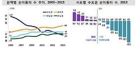 서울과 대전시민은 줄고 세종, 제주, 경기 등으로 모이는 인구는 늘어난 것으로 나타났다.모든 권역에서 순유출이 나타난 것과 달리 충청지역을 중심으로 하는 중부권이 유일하게 인구의 순유입이 나타났다.27일 통계청이 내놓은 '2015년 국내인구이동통계'에 따르면 전출자보다 전입자가 많아 순유입을 보인 시도는 세종(29.0%), 제주(2.3%), 경기(0.8%) 등 9개 지역이다. 전출시도간 이동이 자가 더 많아 순유출을 보인 시도는 서울(-1.4%), 대전(-1.4%), 광주(-0.6%) 등 8개 지역이다.서울 전출자의 60.2%가 경기로 이동했고 세종 전입자의 36.8%는 대전에서 이동했다. 치솟는 주거비를 감당 못해 경기로 빠져나가는 서울시민과, 신규 주택 공급이 원활한 세종으로 전입한 대전시민이 많아졌다는 해석이 가능하다.이지연 통계청 인구동향과장은 "세종시의 경우 중앙행정기관 이전도 중요한 부분이고 2011년에서 2015년까지 4만3000호의 아파트 입주가 이뤄졌다"며 "신규 주택 공급으로 인한 주택수요가 주변 인구를 유입하는 효과를 나타낸 것으로 보인다"고 밝혔다.이 과장은 "서울을 빠져나간 인구의 이동 사유를 살펴보면 주택이 차지하는 비중이 상당히 크