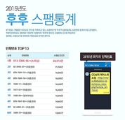 목요일 오전 11시에 스팸전화가 가장 많은 것으로 나타났다.KT의 고객 서비스 계열사 KT CS가 스팸차단앱 '후후'의 2015년도 스팸신고 통계 수치를 20일 공개했다. 스팸전화 유형으로는 '대출권유'(728만3579건·37.8%)가 3년 연속 1위를 차지했다. 이어 ▲휴대전화 판매(16.1%) ▲텔레마케팅(13.9%) ▲불법게임·도박(7.6%) ▲성인·유흥업소(7.3%) 순이었다.스팸신고가 가장 많은 달은 3월(267만766건), 가장 적은 달은 9월(116만1918건)이었다.특히 목요일(376만26건)과 오전11시(239만5910건)에 신고가 몰렸다. 가장 적은 때는 일요일(40만1469)과 새벽 3시(1만3301)였다. 요일로는 목요일에 이어 수요일(374만4766건), 화요일(365만3890건), 금요일(350만7323건), 월요일(349만3062건), 토요일(69만8012건), 일요일(40만1469건) 등의 순으로 스팸이 많이 신고됐다. 시간별로는 오전 11시 다음으로 오후 2시(233만198건)에 스팸이 몰렸다. 이어 오전 10시(218만1105건), 오후 1시(207만1038건), 오후 3시(206만561건), 오후 4시(233만198건) 등