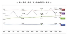암소감축정책과 원유감산정책 등으로 소 사육두수는 줄고 돼지와 닭, 오리 사육량은 늘었다. 8일 통계청이 발표한 '4분기 가축동향조사 결과'에 따르면 한·육우 사육마릿수는 267만6000마리로 전년 동기 대비 8만3000마리(-3.0%) 줄었다. 전분기 대비로는 7만6000마리(-2.8%) 감소했다. 한우는 적정 사육두수 유지를 위한 암소감축 정책으로 지속적인 감소세를 유지하고 있다. 육우는 최근 가격 상승에 따라 증가 추세다. 젖소 사육마릿수는 41만1000마리로 전년동기대비 1만9000마리(-4.5%), 전분기대비 6000마리(-1.5%) 줄었다. 원유감산정책시행에 따른 젖소 감축 및 생산 감소가 원인이다. 가격호조에 모돈이 늘어나면서 돼지는 1018만7000마리로 1년 전보다 9만7000마리(1.0%) 늘었다. 전분기 대비로는 14만6000마리(-1.4%) 줄었다. 산란계는 7187만7000마리로 전년 같은 기간보다 420만3000마리(6.2%) 늘었다. 육계(8185만1000마리)는 가격 하락에도 종계사육 마릿수와 병아리생산이 늘면서 전년 동기 대비 5.3% 증가했다. 조류인플루엔자(AI) 피해를 회복한 이후 육용오리입식이 늘면서 오리 사육바릿수는 97